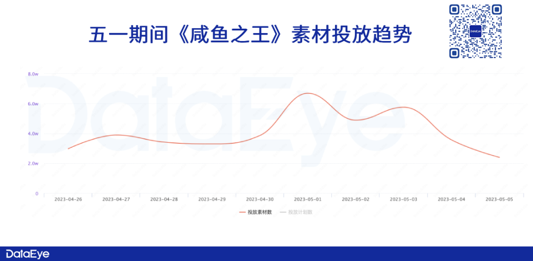 DataEye-ADX数据显示,《咸鱼之王》在五一当天迎来投放量巅峰期,单日素材投放量超6.6万组,同比前一天,增幅达到近100%。