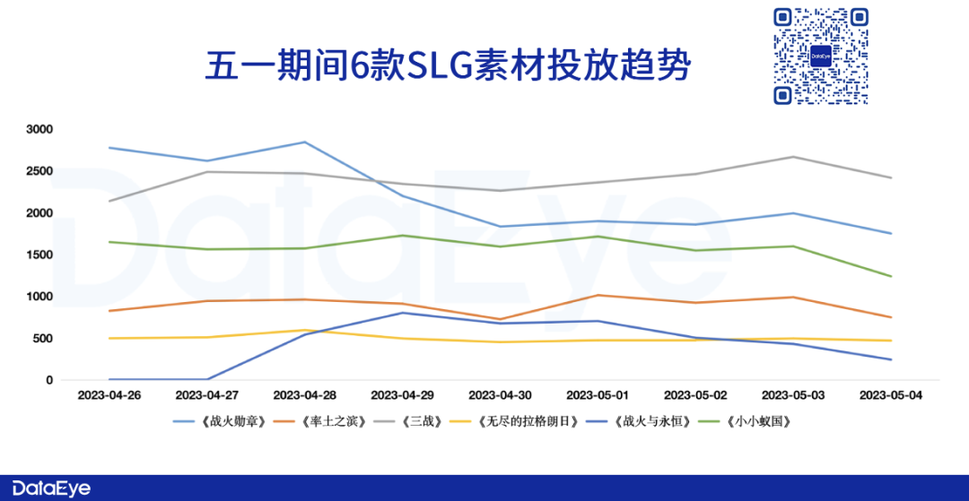 具体到单个产品方面,也同样如此,并没有一款SLG产品在五一期间有较为明显的增加素材投放,甚至主打素材投放的莉莉丝,都没有在《战火勋章》中进行增投,仍保持着与节前同步的投放节奏。