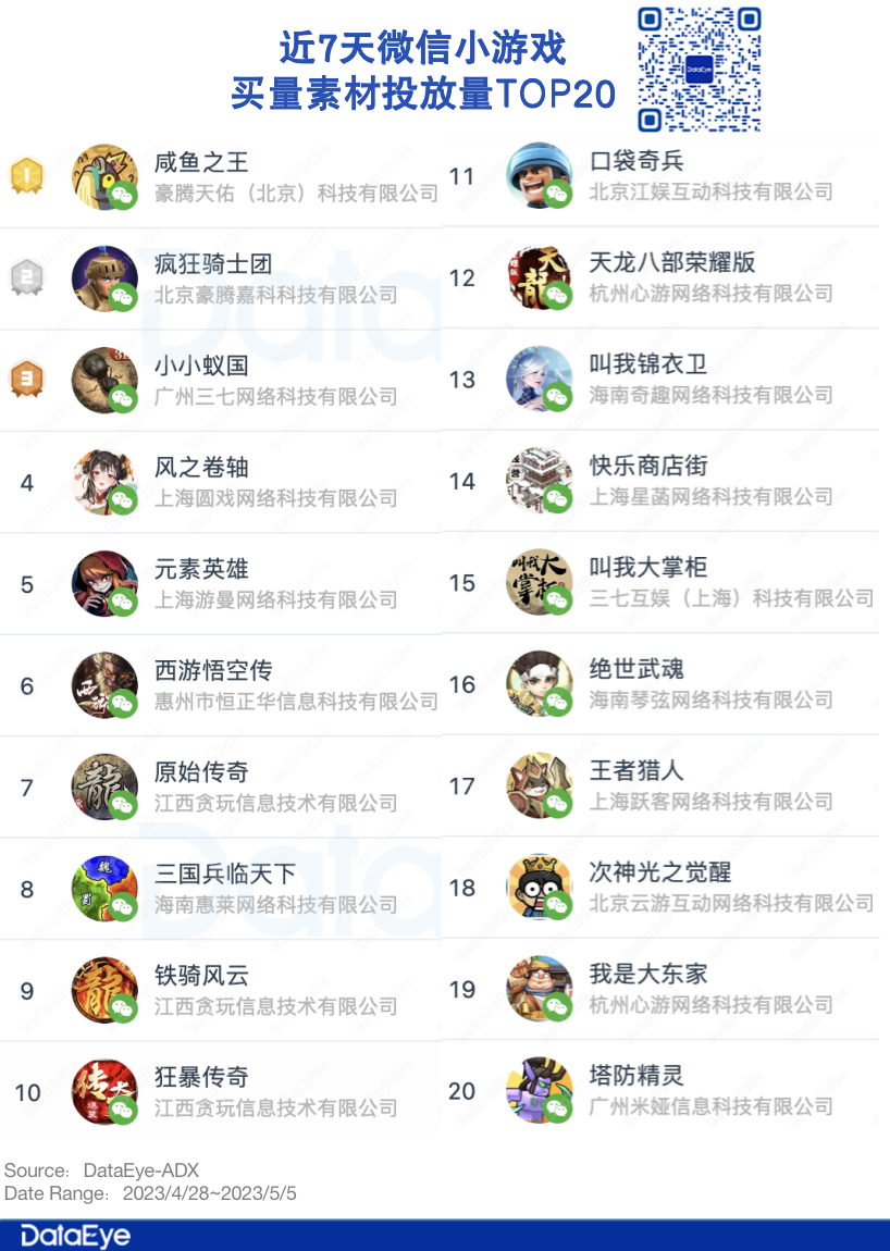 贪玩旗下三款传奇类产品,都跻身小游戏素材投放榜TOP10以内的位置。《西游悟空传》(实际为传奇游戏)、《武道神尊》等传奇小游戏也位列榜单前列。