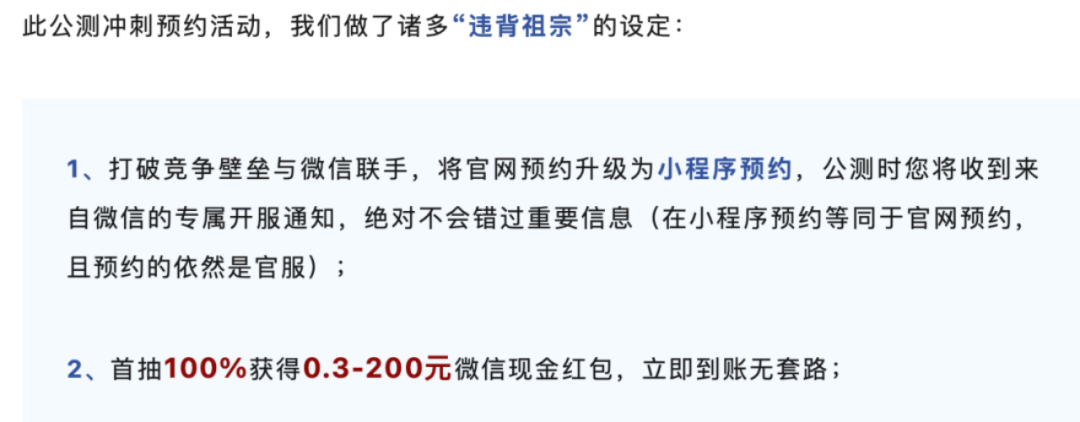 虽然在买量侧动作不大,但在传播侧,却有人偷偷“违背祖宗”。4月28日,《逆水寒》在二测中网易与腾讯合作,推出小程序预约活动,并附带预约即送微信红包的营销套路。据报道,《逆水寒》目前总预约用户数已突破3000万人次。