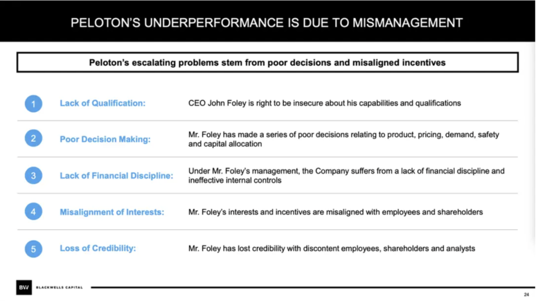 面对着Peloton的糟糕表现,股东Blackwells Capital甚至还给Peloton的董事会写信号召他们罢免CEO并考虑出售Peloton,这封足足有52页长的文件内指明Peloton是纳斯达克300公司中提供股东回报的最差一个,可以说是十分社死了。