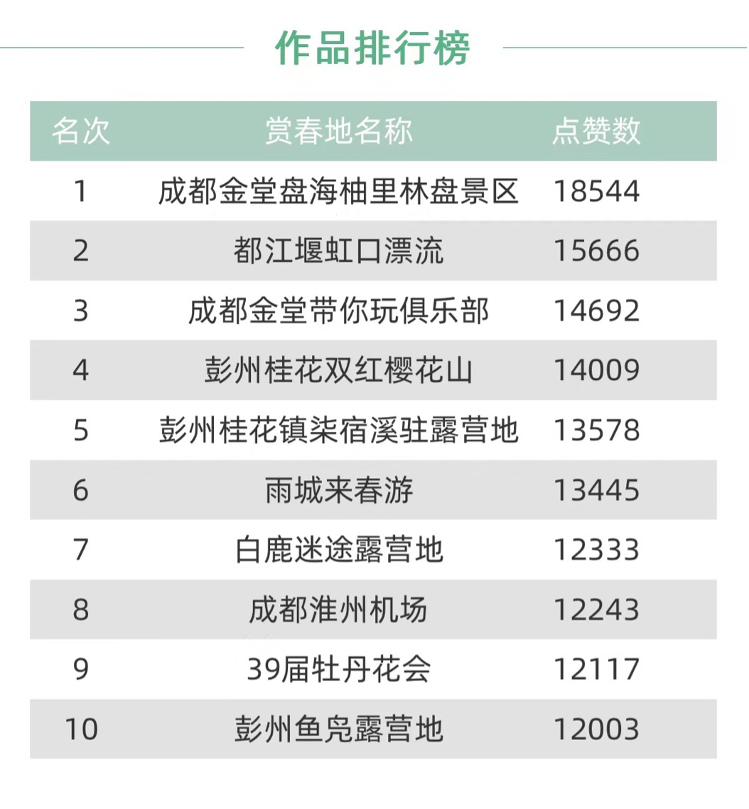 亲子游、去露营、住民宿、尝美食……不用远行,也可以从城市森林走近乡村田园,从市井烟火踏入山林野趣,从家中到户外,感受自然的气息!4月,四川省文化和旅游厅携手四川日报在安逸四川宣推平台发起“安逸四川‘周边游好玩法’推介活动”,邀请各市县文旅部门、景区、文旅达人共同参与,展示身边有哪些好地方、新耍法。省、市、县文旅部门,政府、景区、达人纷纷带#四川周边游好玩法 话题在新浪微博、抖音作周边游攻略。经征集及初审,共有70个四川周边游好玩法在安逸四川宣推平台进行集中展播和点赞。