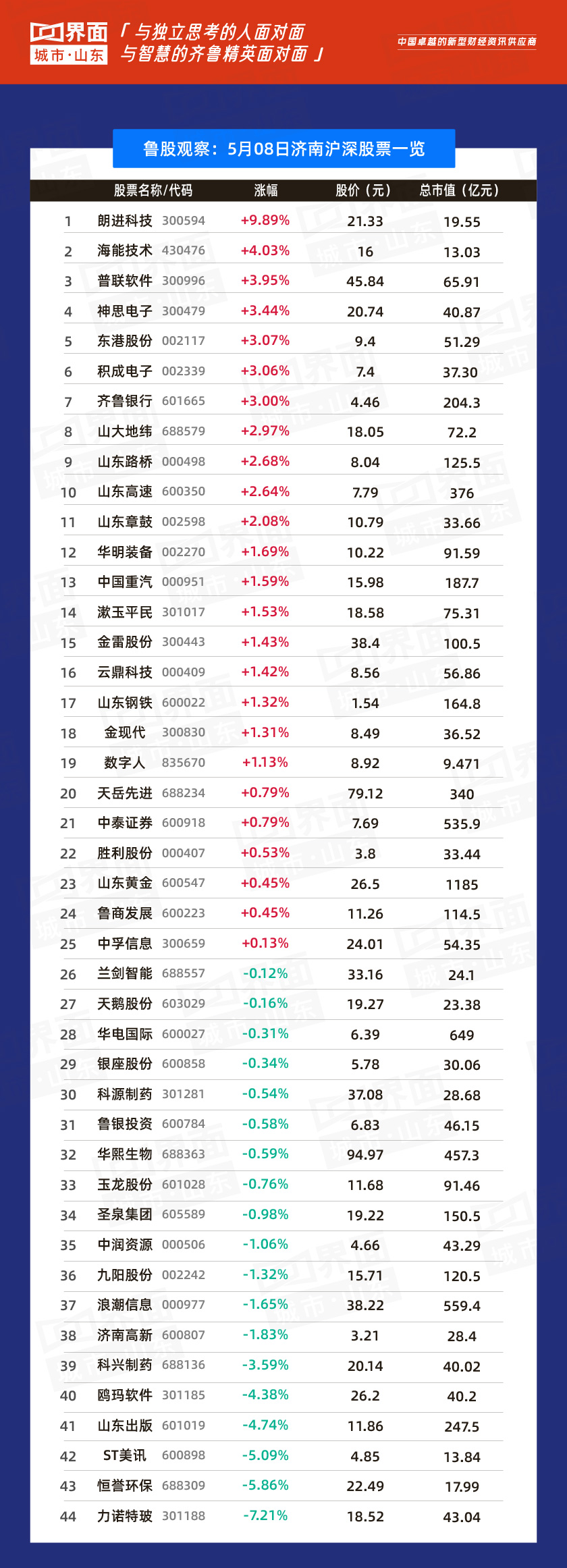 济南市涨幅榜首:朗进科技(300594),涨幅9.89%,股价21.33元,总市值19.55亿元;