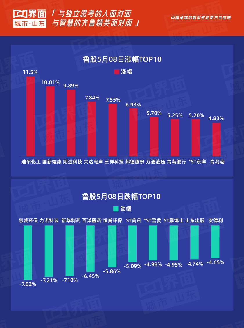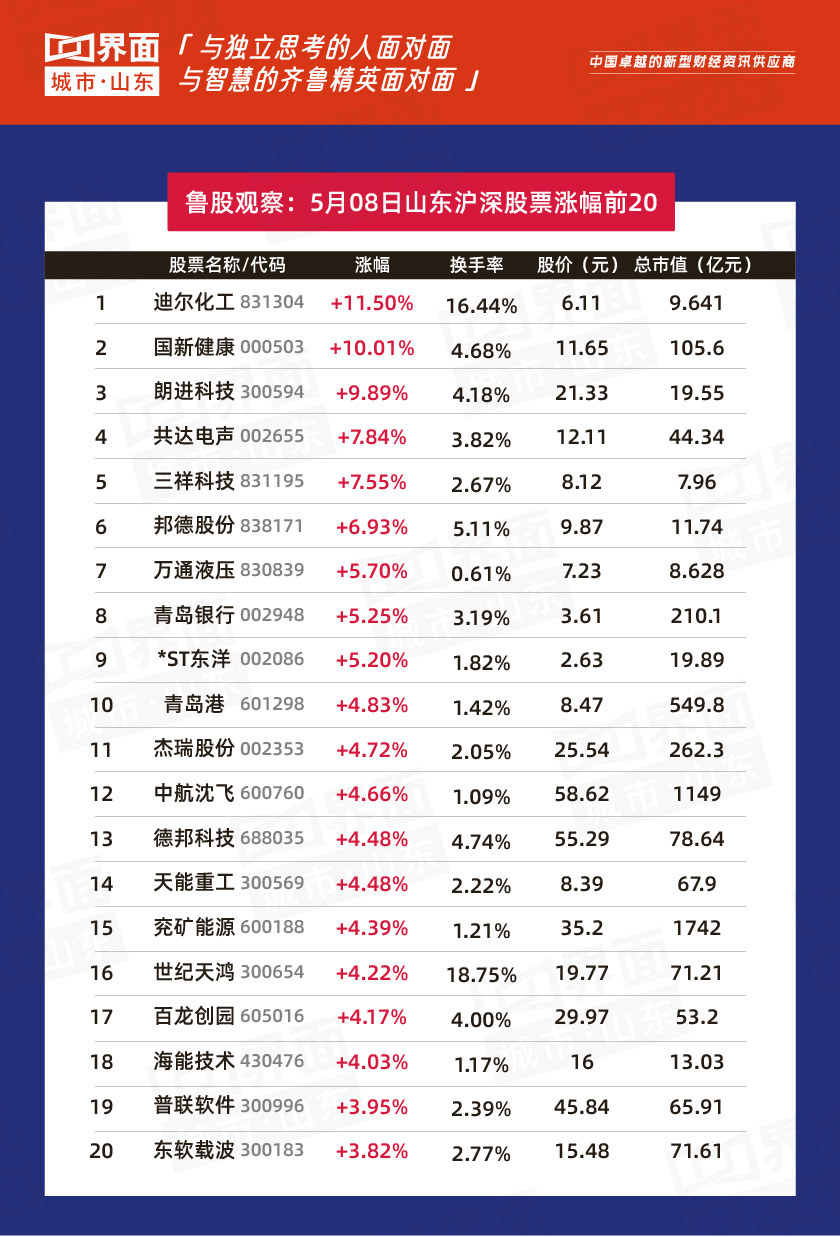 青岛市涨幅榜首:国新健康(000503),涨幅10.01%,股价11.65元,总市值105.6亿元;