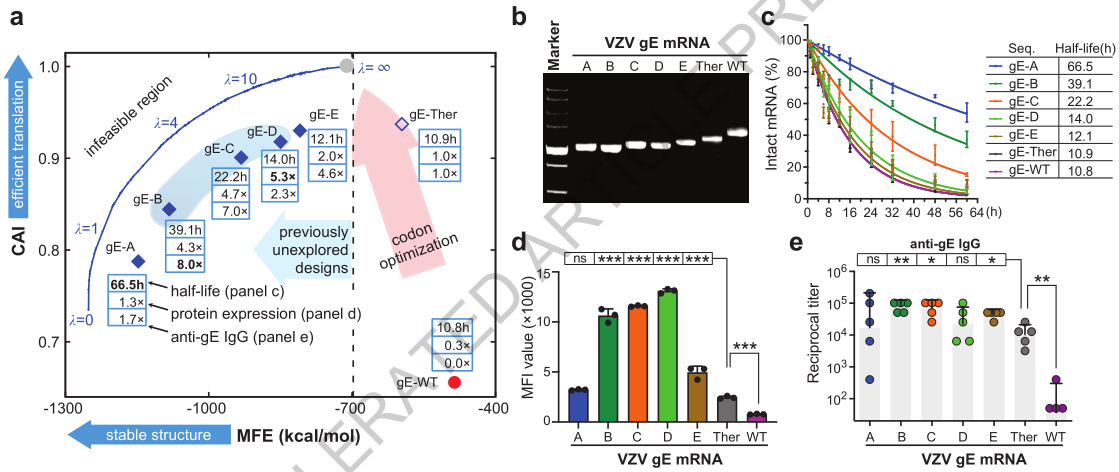 带状疱疹mRNA疫苗生物实验结果。a为实验结果总结,b-c为稳定性实验,d为蛋白表达实验,e为小鼠实验。