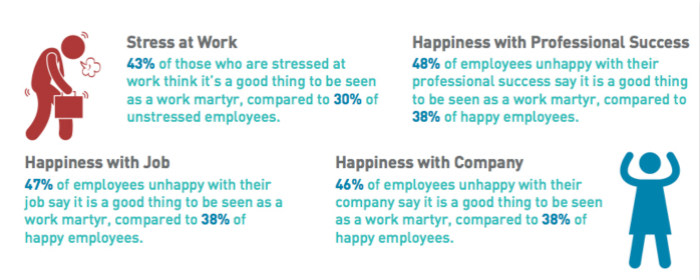 对工作不满的员工更有可能相信工作殉道者理论。47%对工作不满的员工和46%对公司不满的员工相信被老板视作工作殉道者是件好事,毫无疑问,他们往往也会感受到更多的工作压力。