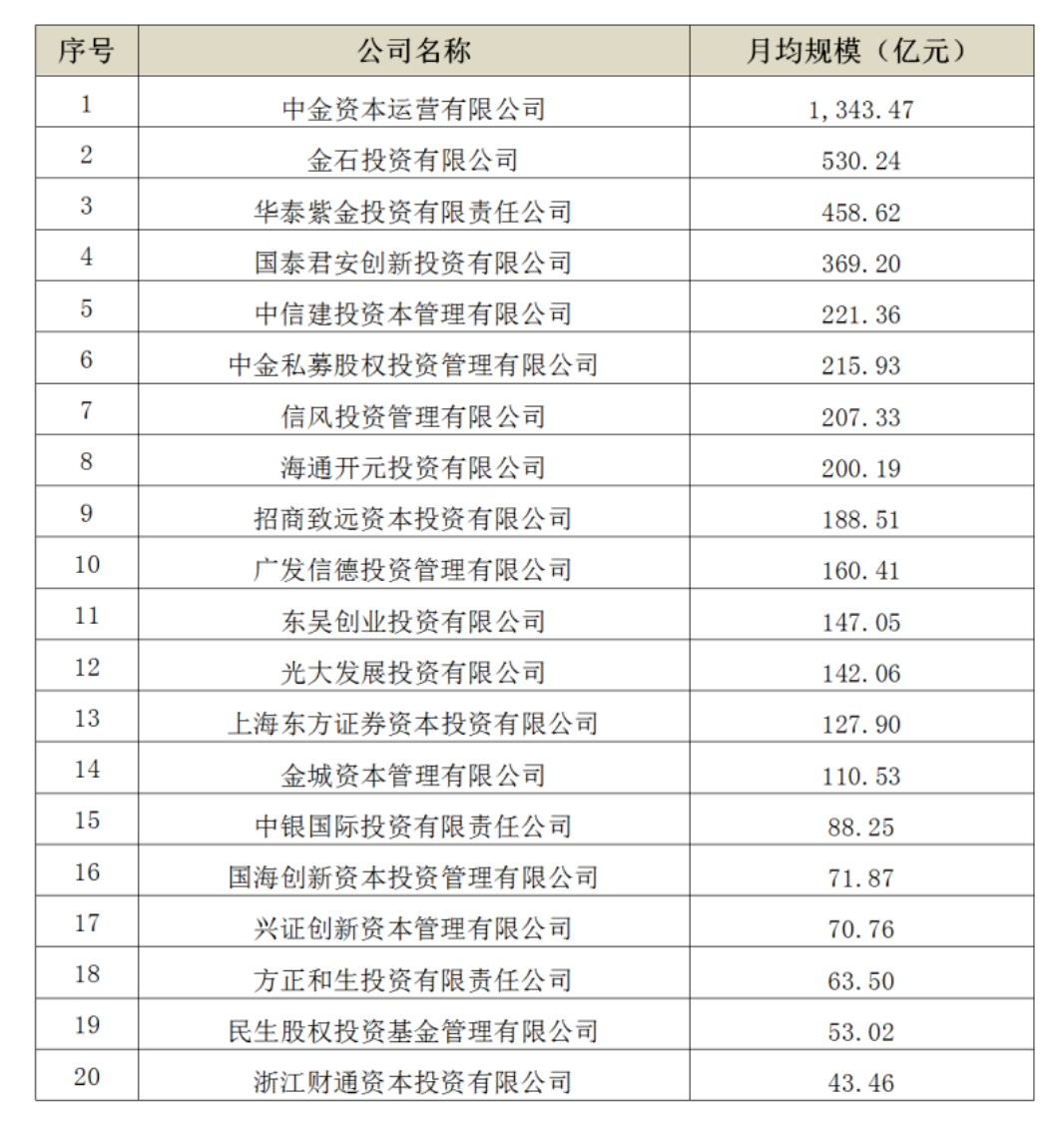 前20强中,中金资本依然高居榜首,月均规模高达1343.47亿元,但较上期末微降39.42亿元;中信证券子公司金石投资530.24亿元位居第二,较上期末增长11.75%;华泰紫金投资、国泰君安创新投资和中信建投资本分居第三到五名。