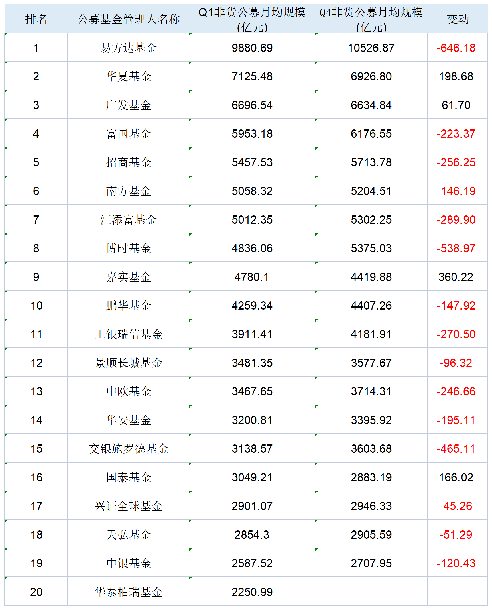 从非货公募的前20强名单来看,相较去年四季度末,除了华夏、广发、嘉实、国泰四家公募管理人出现净增长外,其余多家公募规模均有缩水。