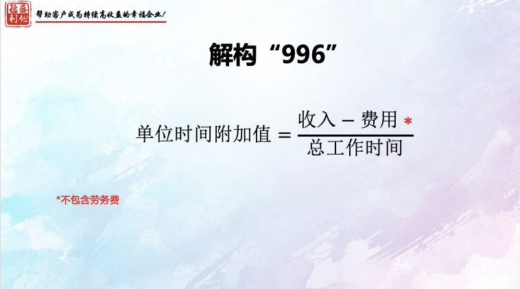 单位时间附加值这一指标中有两个概念:一个是效率,一个是时间。任何一个员工,任何一个部门做任何一项工作的时候,都要考虑这项工作短、中、长期是否有利于提升单位时间附加值?否则,就没有必要去做。这一指标,可以让贡献的真相清晰地呈现出来。