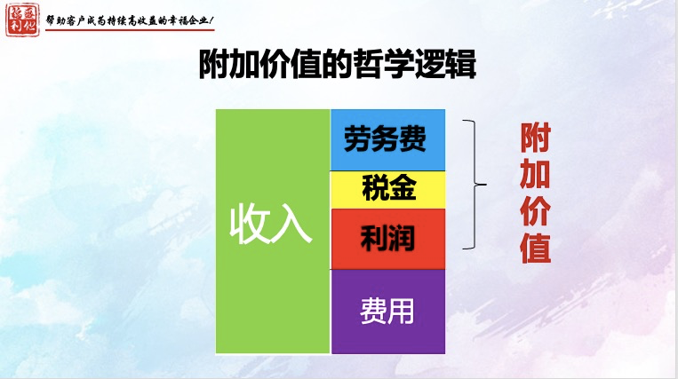 这个时候逻辑就变了,它转移到了企业的外部——提升收入,缩短时间,提高效率。假设通过一年的努力,劳务费如愿提升了50%,基于正确的模型,附加价值也提升了50%,这就意味着利润也提升了50%。这是很奇妙的事情,而且纳税也会同比提升50%。