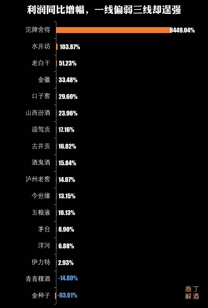 2、让人意外的,茅五洋泸的净利润较同期增幅在10%上下,但是沱牌、老白干、水井坊、金徽酒等都呈现30%以上的惊人增幅。如果,你对照净利润额来看的话,这些惊人的增幅,并没有多少的含金量。