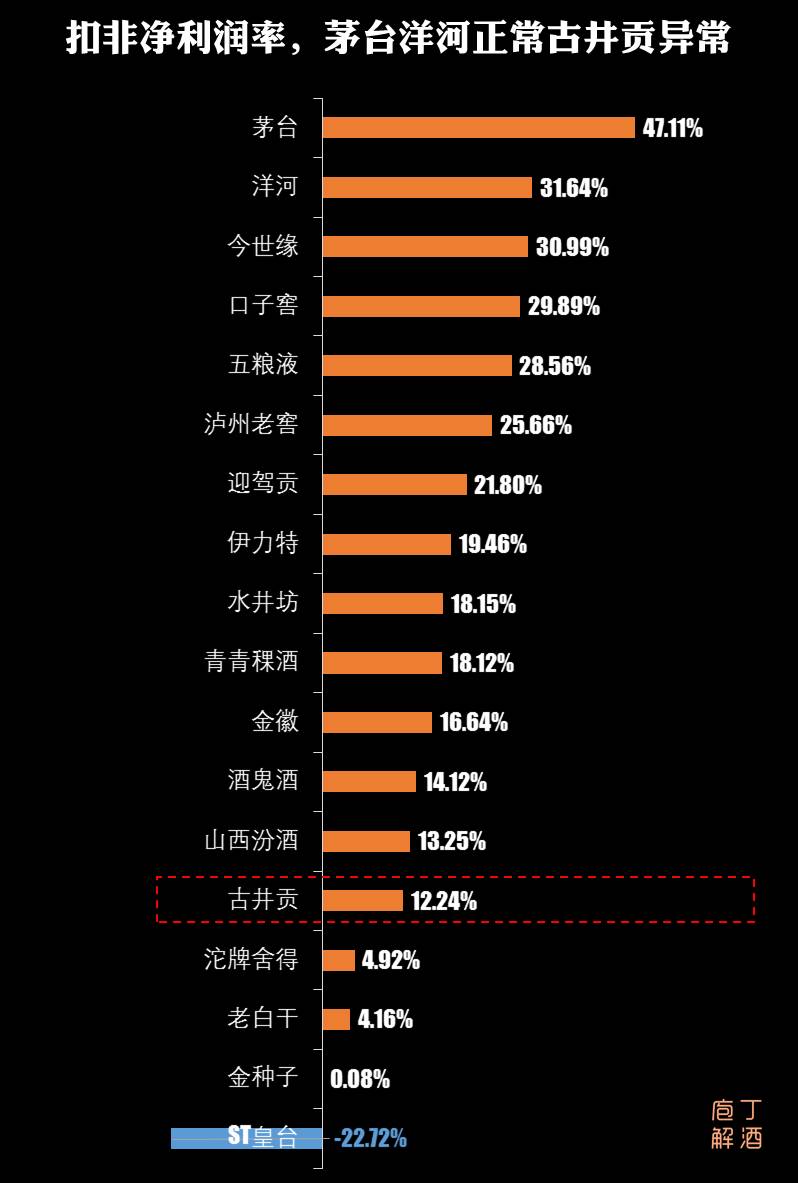3、古井贡,扣非净利润与其营收排名不一致,显示低于主要竞争对手口子窖以及今世缘。收购黄鹤楼、启动全国化,当然这都是要花钱的。