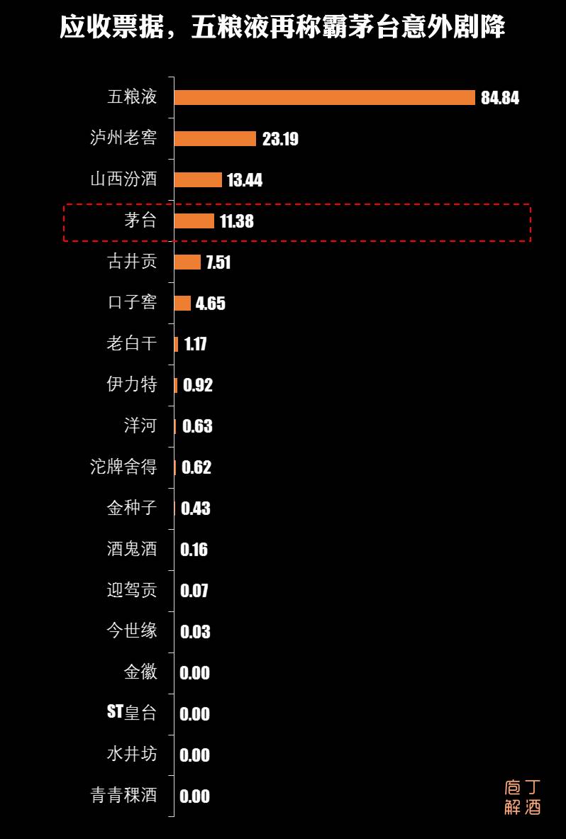 1、应收票据,五粮液延续近3年表现,以近85亿金额,继续排第一。洋河,仍然是一惯的高冷,应收票据非常之少。