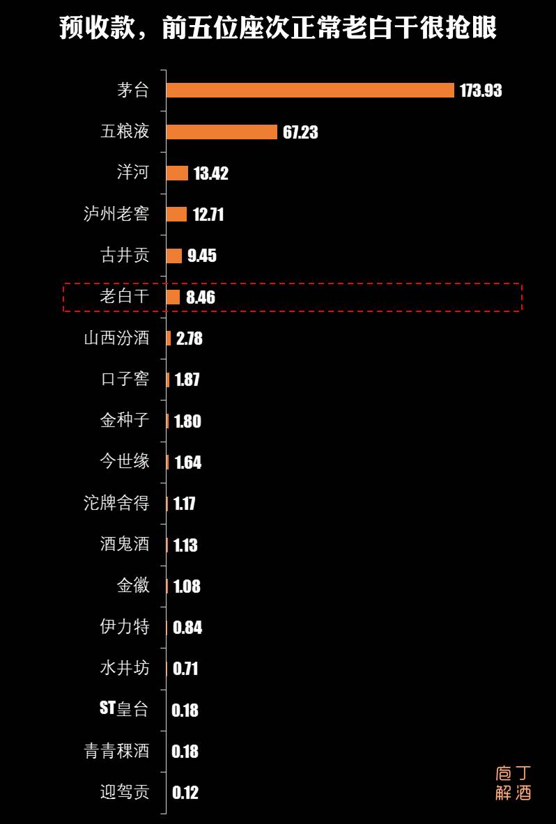 4、最抢眼的,还是老白干。三季度预收款达到8.46亿元,排在18家酒企中的第6位。在中报分析时,庖丁解酒还挺担心老白干的状况(利润持续下滑、净现金流净值负、预收款下降较快至3.81亿),这第三季度预收款就一下子净增了4.89亿(营收只增长了8.92%),庖丁解酒只能表示:奇怪,一时还参透不了这其中逻辑,难道有什么重大利好、渠道政策在刺激。