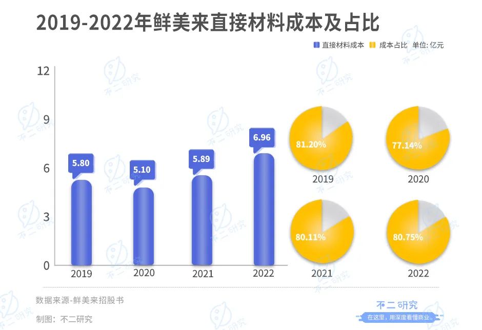 「不二研究」认为,由于鲜美来业务发展受制于上游,其毛利率很大程度上受到原材料采购费用的拖累。根据招股书,2019-2022年,鲜美来采购的直接材料分别为5.80亿元、5.10亿元、5.89亿元和6.96亿元,在主营业务成本中的占比分别为81.20%、77.14%、80.11%和80.75%。