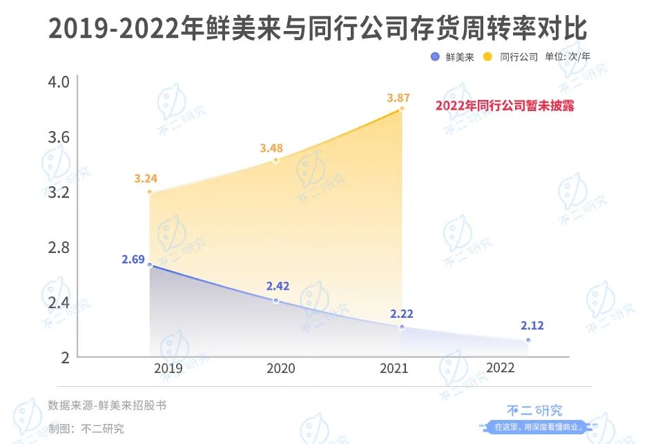 招股书显示,2019-2022年,鲜美来的存货周转率分别为 2.69次/年、2.42次/年、 2.22次/年和2.12次/年,2019-2021年行业平均存货周转率分别为3.24次/年、3.48次/年和3.87次/年。同行业其他公司的产品结构更加丰富,季节性特征弱于水产品,采购与销售关联更为紧密,因而存货周转较快。