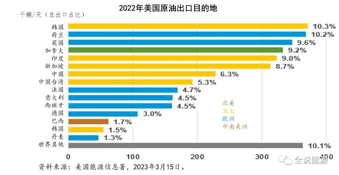 2022年,美国平均每天出口原油360万桶,比2021年增长了22%(64万桶/天),其中对欧洲的原油出口增长了41%(43.7万桶/天),当年增加购买美国原油的十大出口目的地中,有七个在欧洲,荷兰(10.2%,36.8万桶/天)和英国(9.6%,34.7万桶/天)是第二和第三大美国原油进口国。