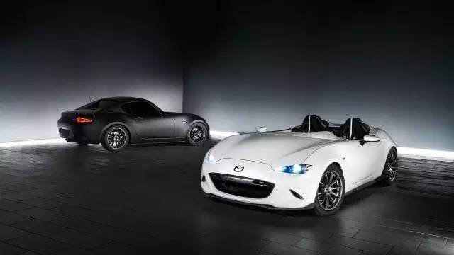 MX-5 Speedster Evolution概念车没有车顶,也没有前风挡(小编看了看外面的温度,脑补了一下现在开这车的情景),采用碳纤维材料打造的门板、座椅等,车重仅898kg。MX-5 RF Kuro就像它的名字一样,黑暗而深邃。