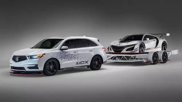 NSX GT3/MDX。NSX GT3搭载3.5L V6双涡轮增压发动机,匹配6挡变速器,放置于一拖车之上。MDX车身降低,配备碳纤维前唇、加装20寸轮毂。