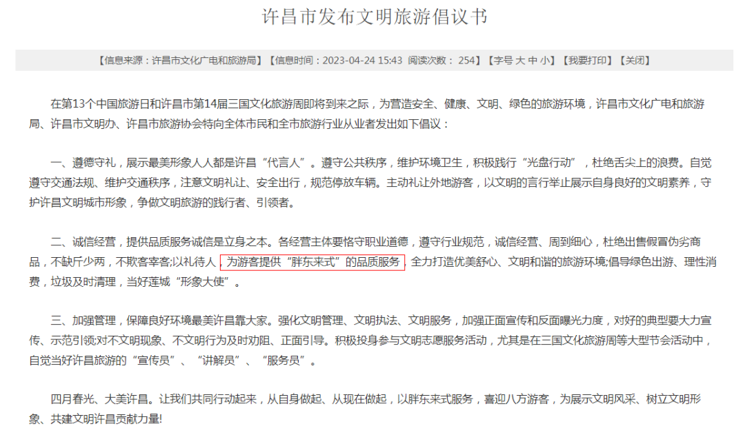 今年五一假期前,许昌文旅局就发出倡议书,号召旅游行业从业者为游客提供“胖东来式”的品质服务。