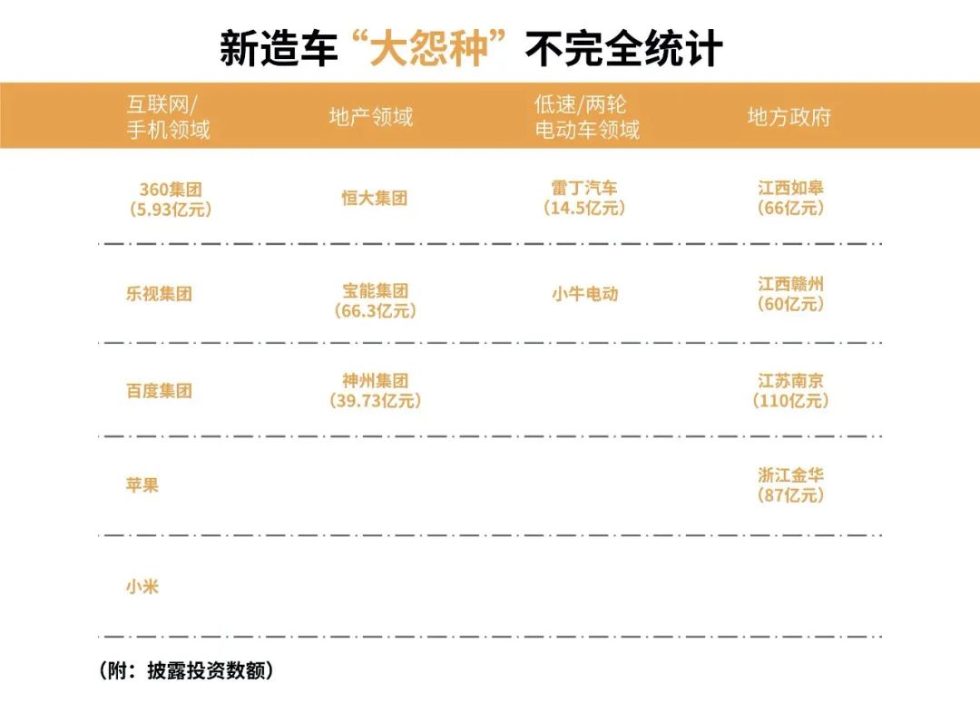 在业内,造车烧钱是共识。如果家底不够厚,面临甚至有可能是暴雷甚至破产的命运。但尽管如此,身处其中的每个人依然愿意相信自己会是胜者。其中,互联网和手机行业作为和新汽车联系最为紧密的领域,当仁不让地涌现出一批又一批的“造车者”。
