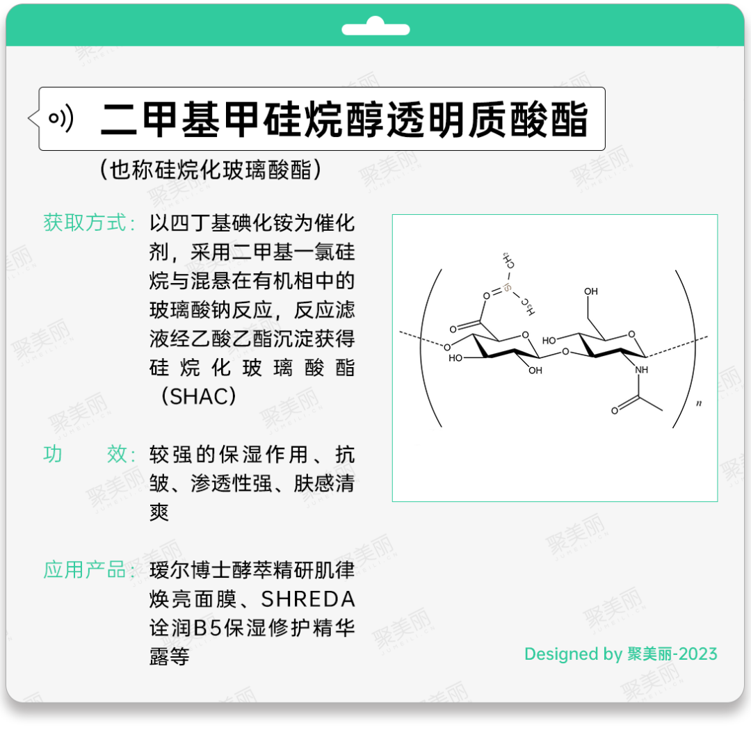 应用在化妆品中,该类透明质酸能够在皮肤表面形成长效生物保护膜,具有锁水、储水、隔离、防护等作用,也可用作水溶性或油溶性活性物质的传递系统。