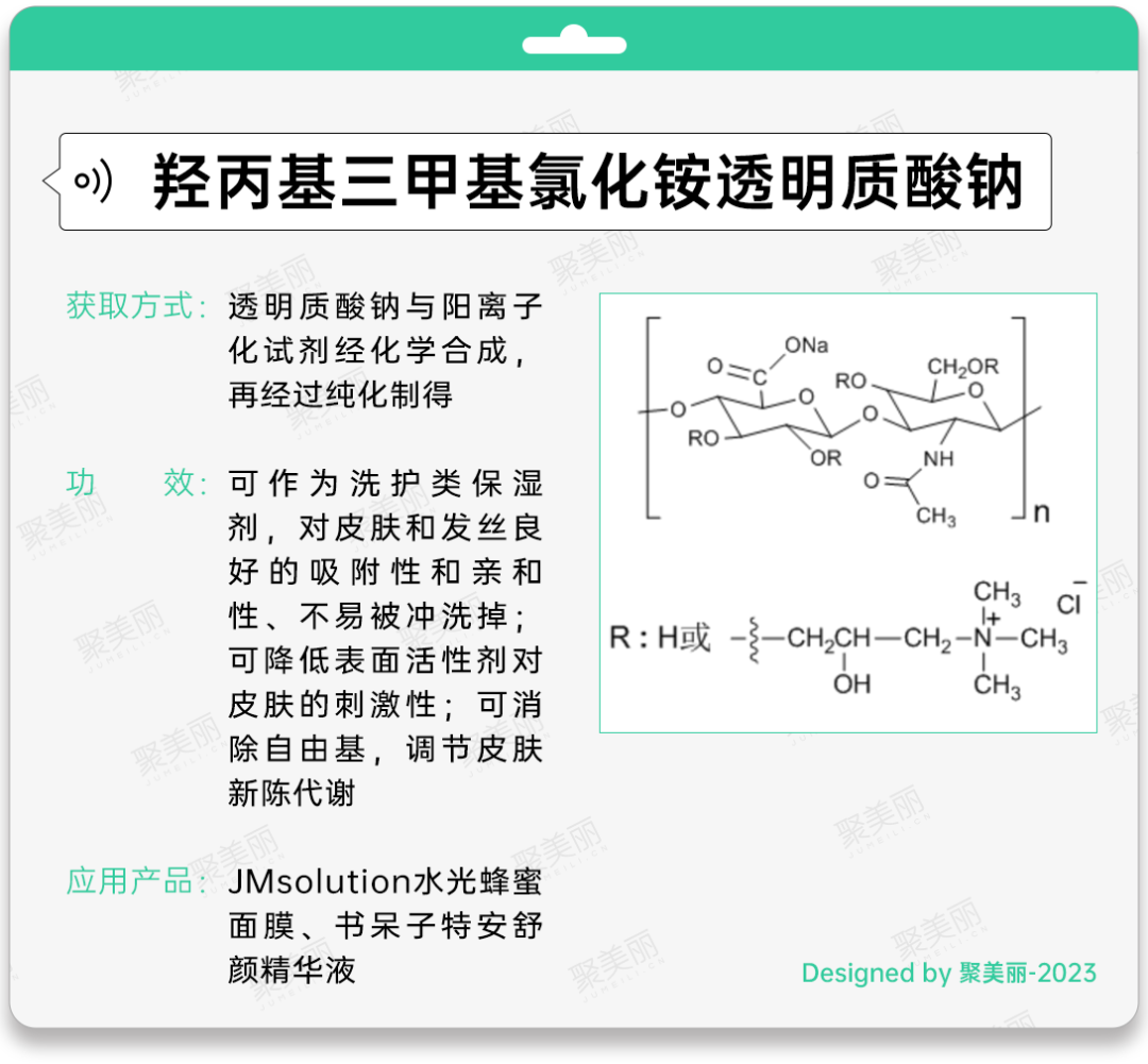 而羟丙基三甲基氯化铵透明质酸钠,是一种阳离子化的透明质酸钠,山东众山生物科技有限公司的SMOHYA 致泽原料的主要物质就是该化合物。