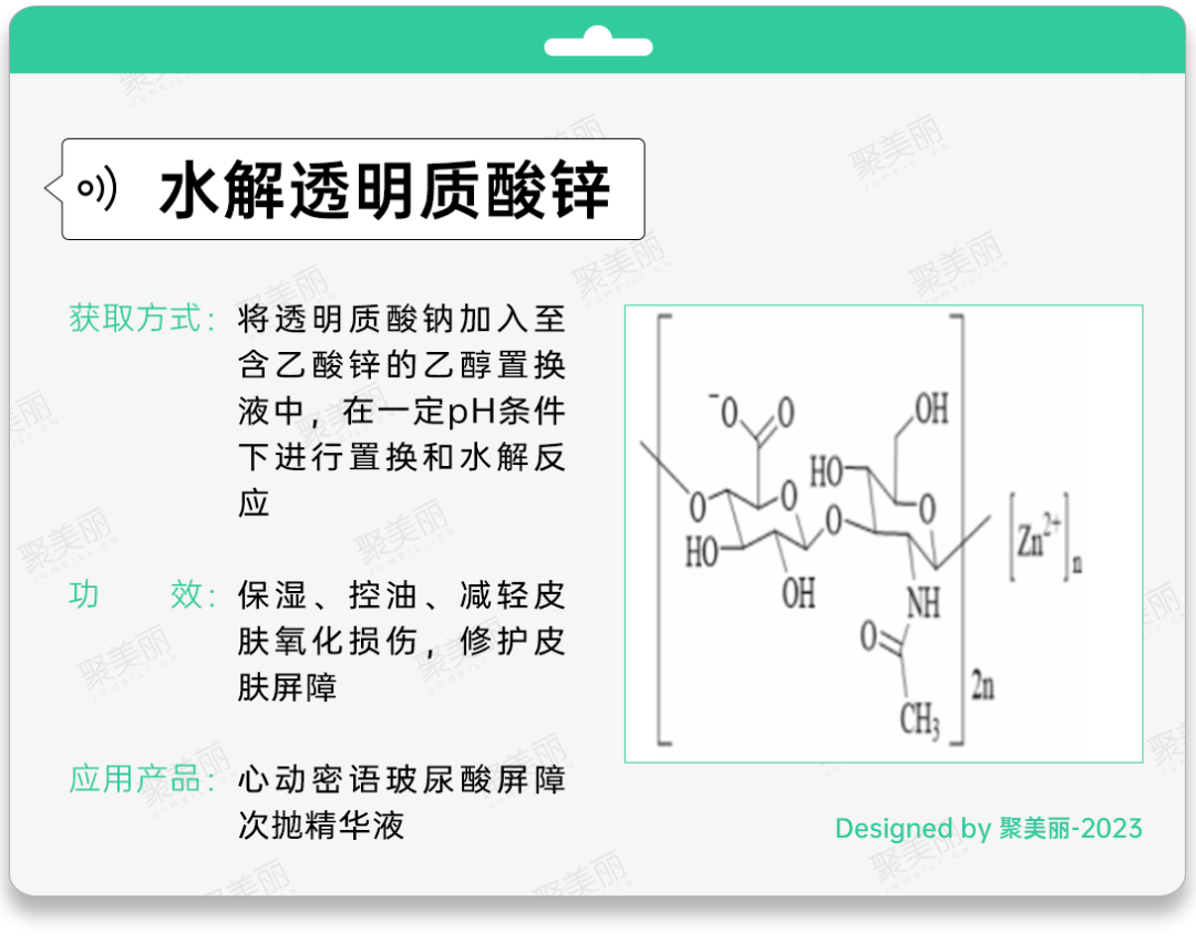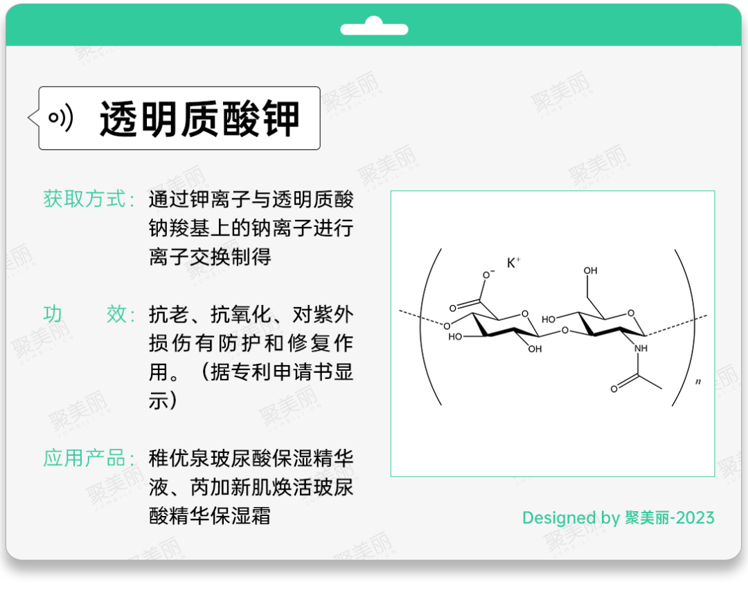 透明质酸钠便是羧基的氢离子被钠离子取代得到的钠盐,氢离子被金属离子取代生成的成分还有,华熙生物先后推出的水解透明质酸锌、水解透明质酸钙、透明质酸钾,前两项成分已于2022年完成化妆品新原料备案,透明质酸钾于2022年11月完成专利申请。