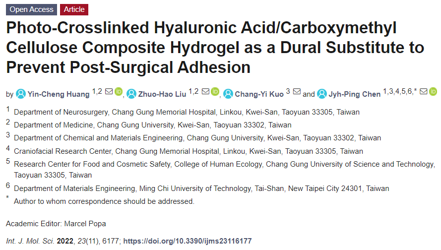 2022年,《International Journal of Molecular Sciences》杂志上发布了一篇文章,长庚大学的Jyh-Ping Chen教授团队开发了光交联透明质酸(HA)/羧甲基纤维素(CMC)水凝胶作为硬脑膜替代品。