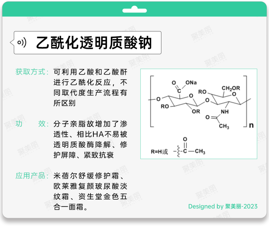 乙酰化透明质酸钠由透明质酸钠经乙酰化反应得到,由于单位结构中有4个羟基可被乙酰基取代,故会有0-4不同取代度的乙酰化透明质酸钠。