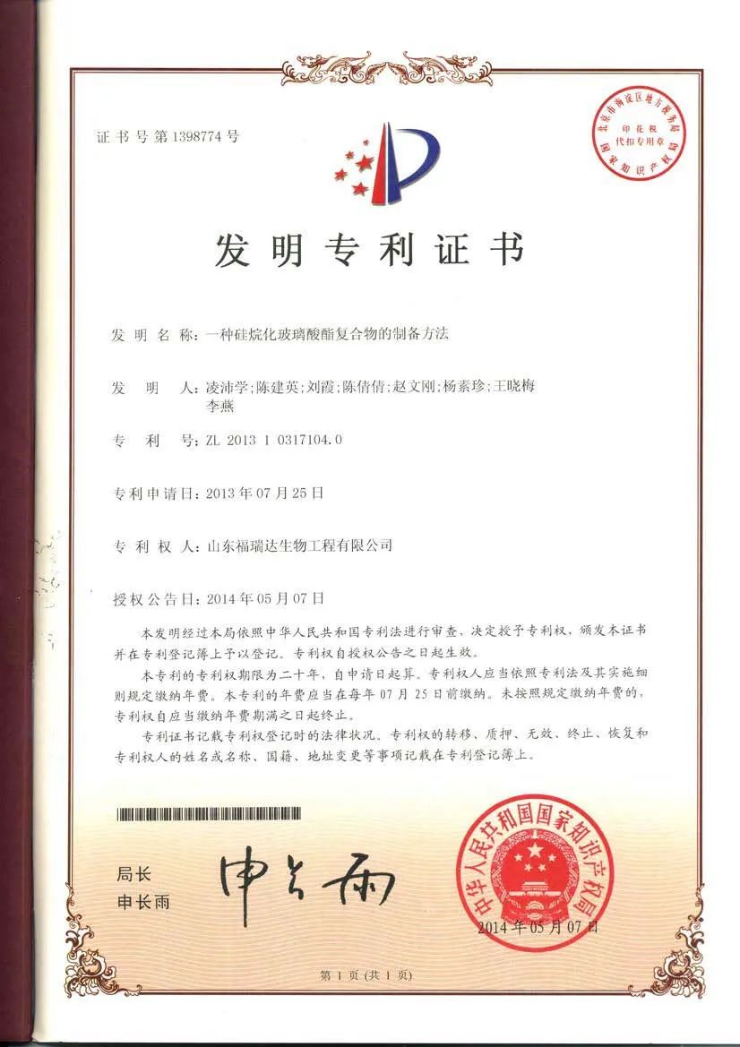 2014年5月,山东福瑞达生物工程有限公司的“一种硅烷化玻璃酸酯复合物的制备方法”的发明专利获得授权,并且该专利的相关论文在日用化学工业发表。专利和论文描述的便是一种透明质酸酯类化合物。
