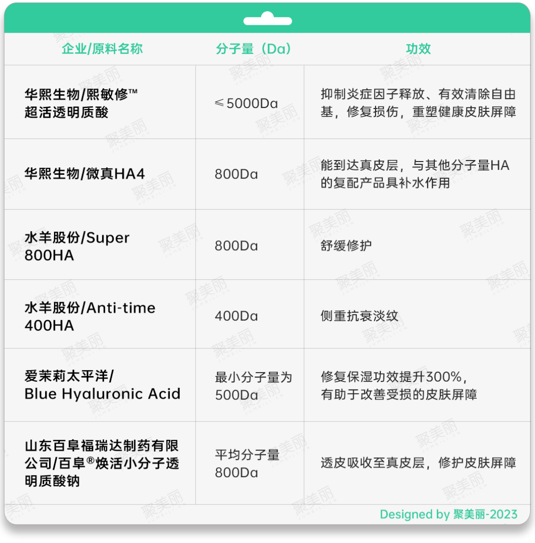 据公开资料显示,目前有多家企业推出了寡聚透明质酸原料,分子量大小和功效也不尽相同。