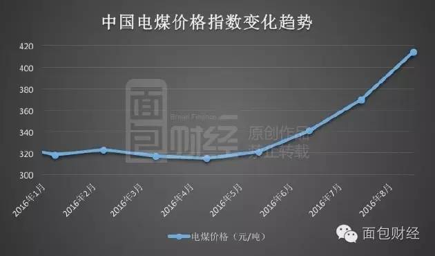 发改委数据显示,今年9月份全国平均电煤价格指数为414.07元/吨。与5月份的315元/吨相比上涨近百元,平均每月煤价上涨25元/吨。下图是面包财经绘制的中国电煤价格指数变化趋势图: