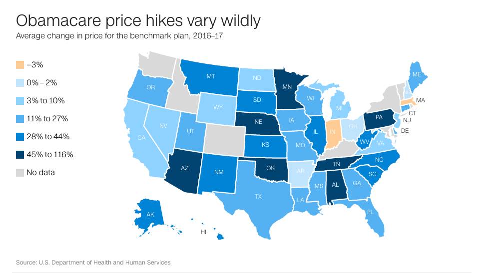 ①保费大涨:10月24日,美国卫生部公布消息, 2017年奥巴马健保保险费将平均上调22%,美国绝大部分州保费都上涨,其中加州保费上涨了7%,亚利桑那州更是上涨了116%!