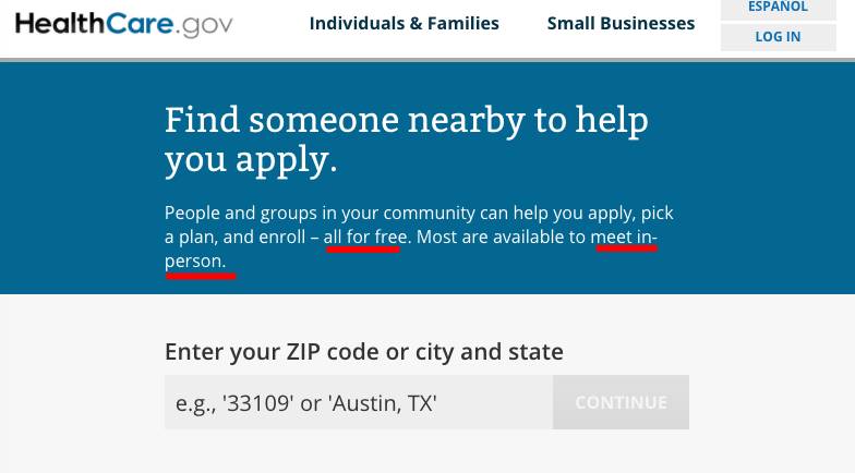 寻找当地的专业社工,帮你面对面、手把手免费注册。只需在https://localhelp.healthcare.gov/#intro输入你的邮编,即可获得当地社工信息。你可以联系当地的各种正规保险公司、代理顾问等,给你提供最专业的咨询。
