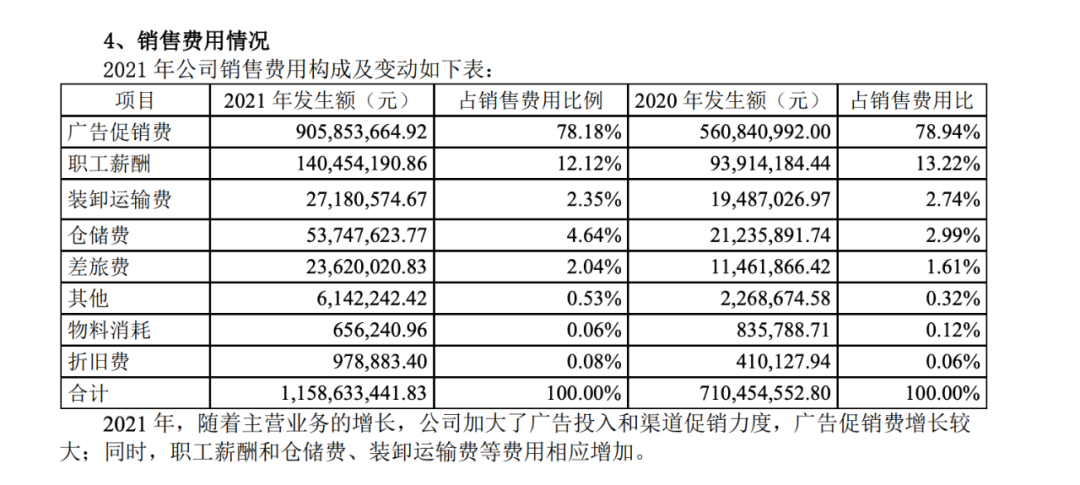 与此同时,妙可蓝多的营销投入也几乎呈现出逐年翻倍上涨的趋势:财报显示,2017年-2022年,公司销售费用分别为1.23亿元、2.05亿元、3.59亿元、7.11亿元、11.59亿元和12.19亿元。其中2020年,妙可蓝多在广告促销费上的支出为5.61亿元,占销售费用比重高达78.94%。