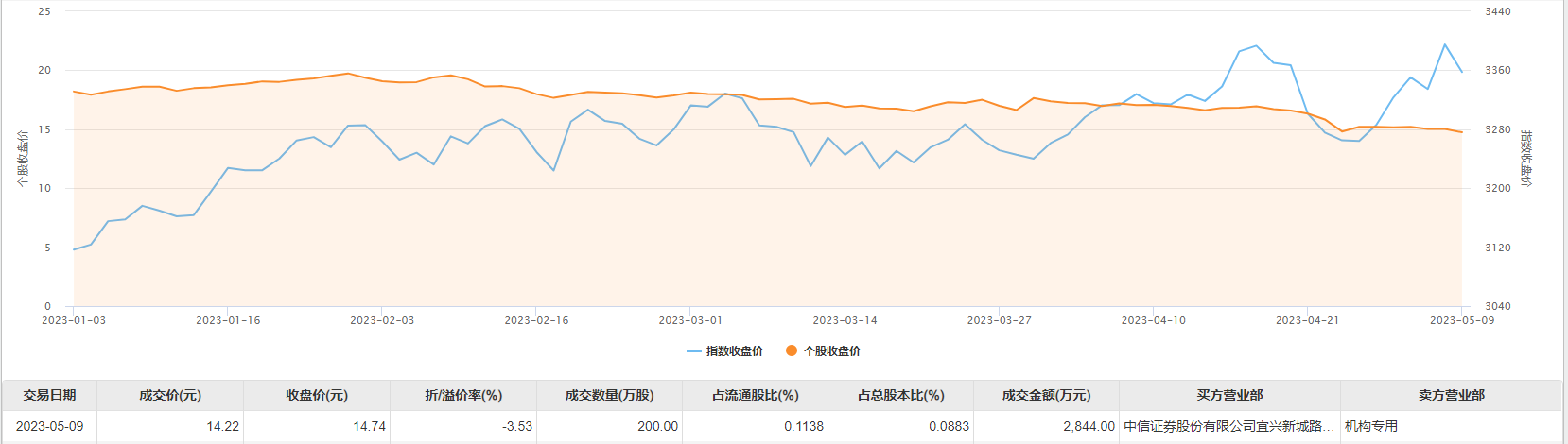 杉杉股份5月9日大宗交易成交200万股,成交额2844万元,占当日总成交额的10.23%,成交价14.22元,较市场收盘价14.74元折价3.53%。