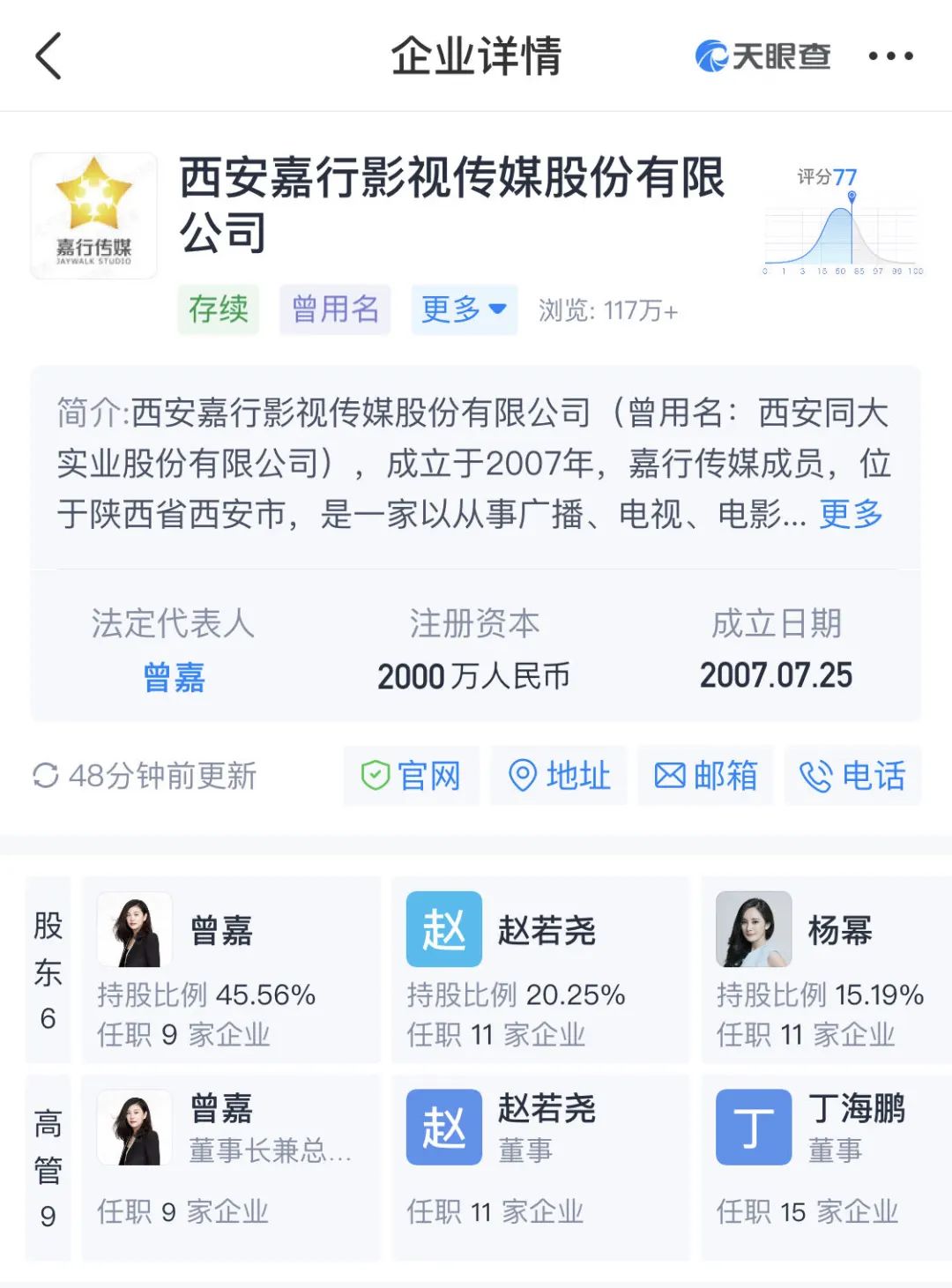 嘉行传媒的创始人一共有三位,杨幂及其经纪人赵若尧和曾嘉。天眼查资料显示,曾嘉、赵若尧分别持有西安嘉行影视传媒股份有限公司约45.56%、20.25%,为前两大股东;杨幂持股约15.19%,为第三大股东。其中曾嘉是嘉行传媒最大的股东和实际控制人。