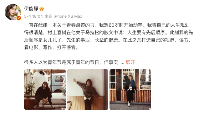 众所周知的是,伊能静的文采早在一篇篇微博小作文中尽数展现,从记录儿子哈利、女儿米粒成长的点滴,到记录与秦昊之间的情感生活,再到分享娘家姐妹的故事,在以优美的文笔娓娓道来间,细腻的情感亦在字里行间流淌。