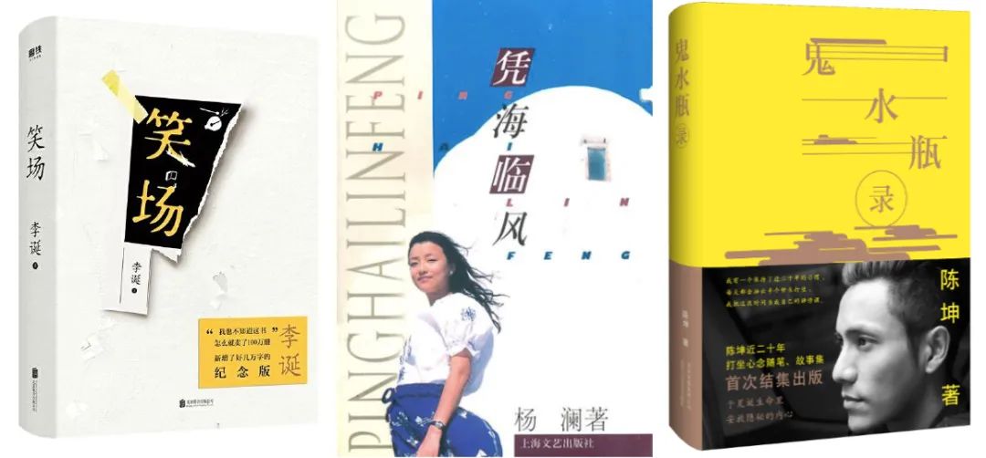 这类书籍主要以小说、诗歌、散文为主,且数量较少。小说方面,有代表性的是脱口秀演员李诞出版了《笑场》《宇宙超度指南》《冷场》《候场》、陈坤的首部小说随笔集《鬼水瓶录》、演员任重和邱美煊联合创作了小说《宛平城下》;诗歌方面,海泉出版了诗集《海泉的诗》,收录了他从学生时代到2012年前的300余首诗;散文方面,杨澜出版了《凭海临风》《世界很大,幸好有你》《天下女人》系列散文集,江一燕先后出版了《我是爬行者小江》《在时光里流浪》两本散文随笔集。