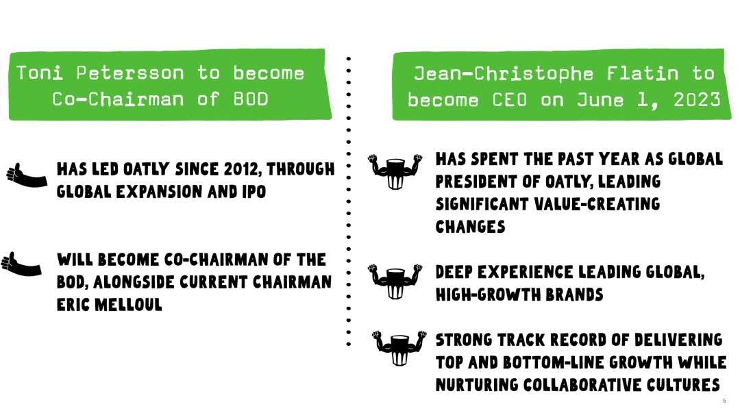 根据最新安排,OATLY现任首席执行官Petersson将与现任董事长Melloul一道,成为该公司的董事会联席主席。