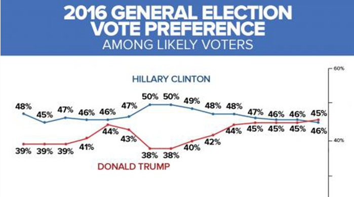 美国广播公司(ABC)与华盛顿邮报(Washington Post)的最新民调显示,共和党总统候选人特朗普(Donald Trump)的全美支持度为46%,希拉里(Hillary Clinton)为45%,特朗普追赢希拉里1个百分点。