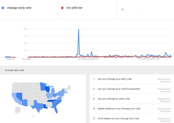 google大数据告诉我们大量希拉里早投票选民后悔了。FBI重启希拉里邮件门调查后搜”change early vote"的暴涨。