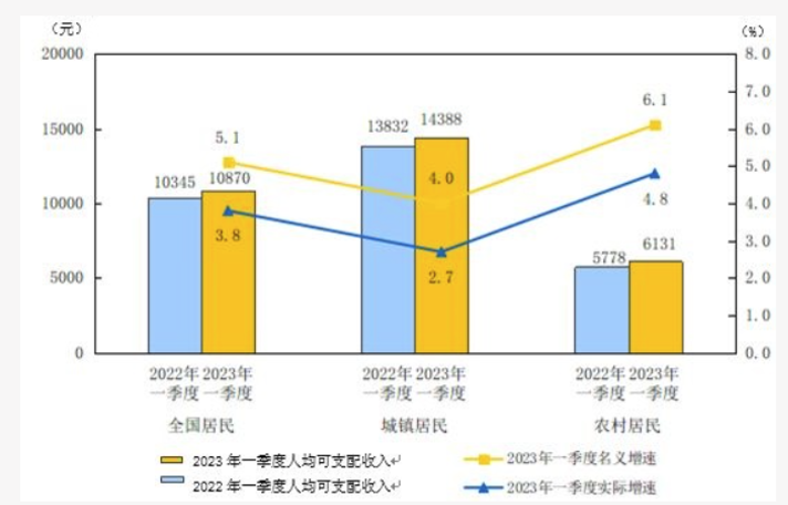 2023年一季度全国及分城乡居民人均可支配收入与增速 来源:国家统计局