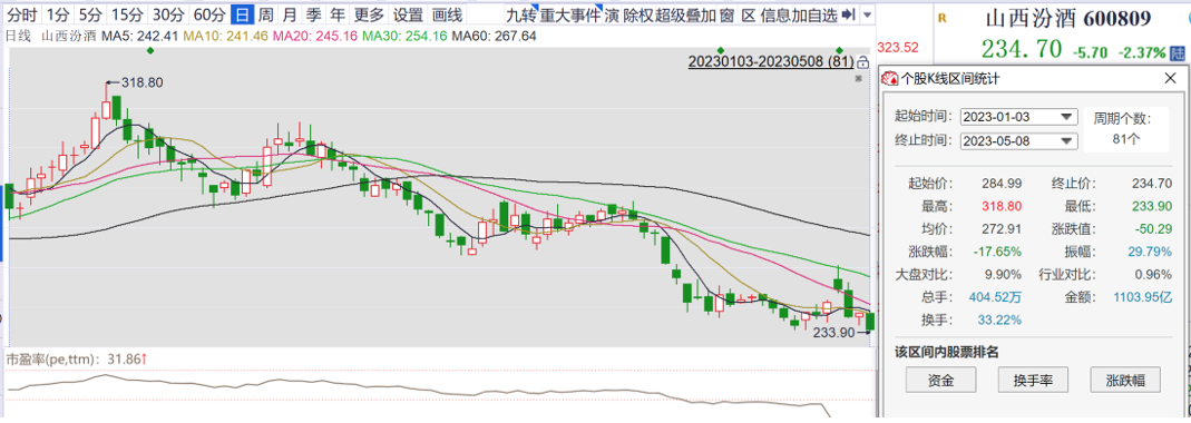 从增长上来说,山西汾酒是次高端白酒里增速领先的酒企。但今年以来汾酒股价持续走低,从1月13日高点318.8元回落至今,最大跌幅超27%,远超同期中证白酒指数跌幅11.94%。