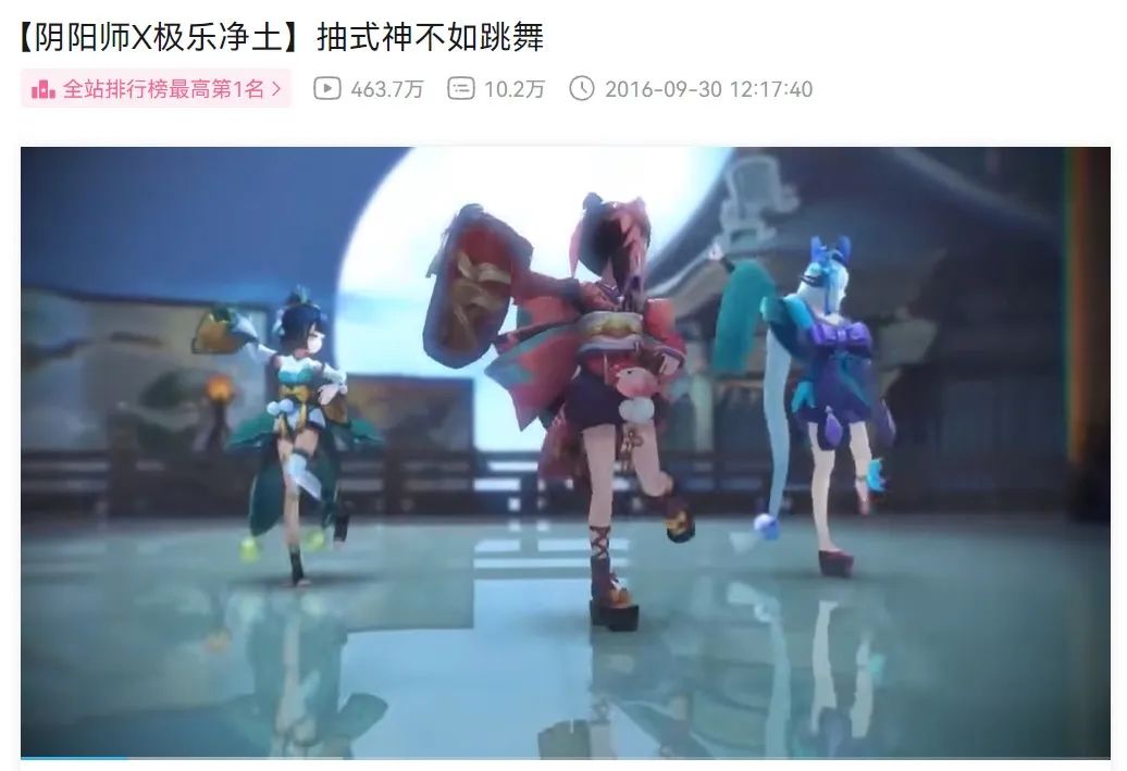 在B站上搜“极乐净土”时,综合排位第二的MMD视频“【阴阳师*极乐净土】抽式神不如跳舞”,在当时看起来不过是公测仅半月的《阴阳师》“蹭”歌曲热度跟风创作的二创视频。而7年后当玩家们发现这一系列操作竟然是游戏官方的一次规模型营销策划活动时,无不感叹“当时以为是游戏蹭歌的热度,想不到歌变成了游戏的宣传曲……”