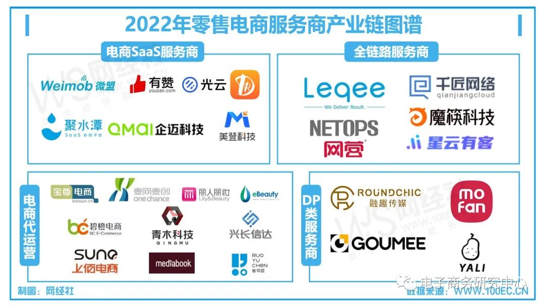 据网经社企业库(COP.100EC.CN)显示,目前电商服务商包括:电商代运营商类:宝尊电商、丽人丽妆、壹网壹创、若羽臣、青木股份、碧橙电商、兴长信达、上佰电商等;电商SaaS服务商类:微盟、有赞、光云科技、聚水潭、企迈科技、美登科技、大人小店;全链路服务商:乐其电商、千匠网络、网营科技、魔筷科技、星云有客等;DP类服务商:融趣传媒、魔范璐玛、构美、新烛文化、鸭梨互动等。