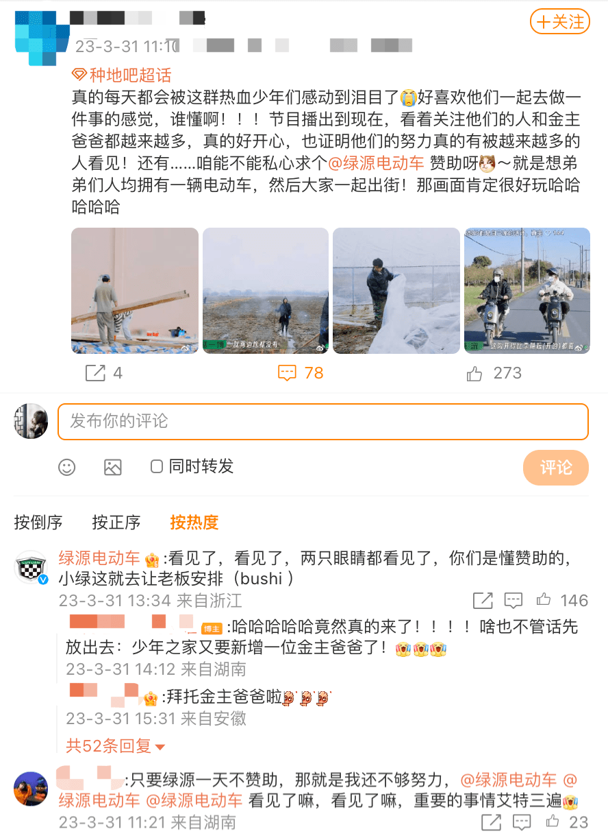 长综艺对于品牌的宣传和加持也能看得见。比如粉丝为《种地吧》拉赞助,得到绿源电动车的回应,而后绿源电动车与粉丝的互动和与节目的一系列营销玩法,让其官宣赞助即登上热搜,并获得粉丝后续的自发安利。