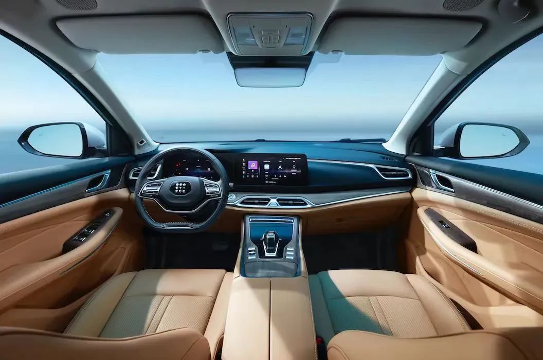 内饰层面,蓝电E5采用了新能源汽车行业目前主流的设计,包括由全液晶仪表盘+中控大屏的双联屏,以及简约和干净的内饰风格。
