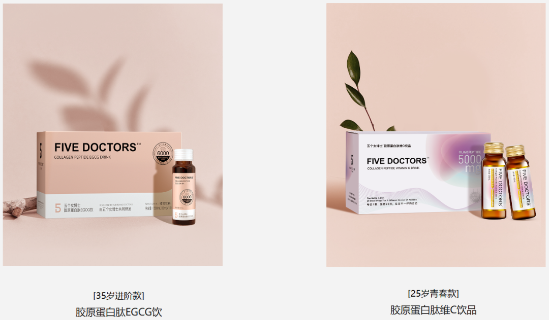 根据五个女博士的官网介绍,五个女博士主推产品为售价249元一盒的胶原蛋白肽维C饮品、399元一盒的每日亢唐植物饮品、399元一盒的胶原蛋白EGCG饮和299元一盒的白密码运动恢复饮料。而其对产品的功效宣传也集中于“改善皮肤”、“健康”、“美容”等关键词。